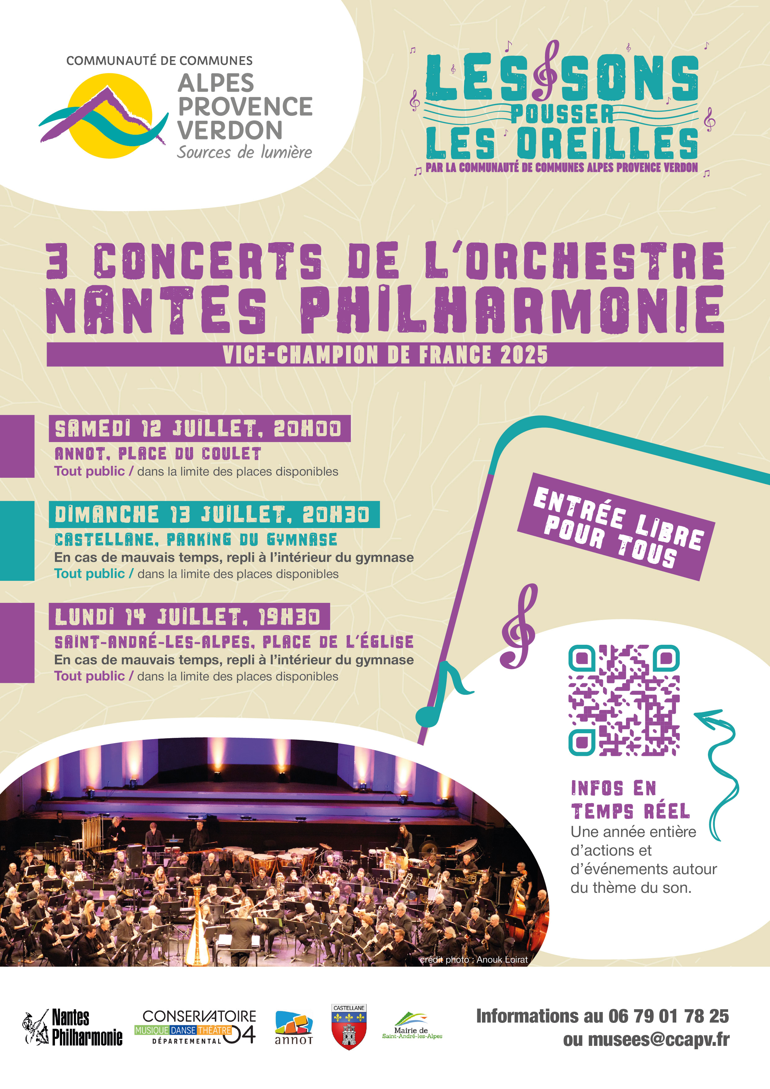 Le 14 juillet, l’orchestre Philharmonique de Nantes donnera un concert en plein, place de Verdun, à côté de l’église. Ce concert gratuit commencera à 19h30, et est à l’initiative de la Communauté de Communes Alpes Provence Verdon.